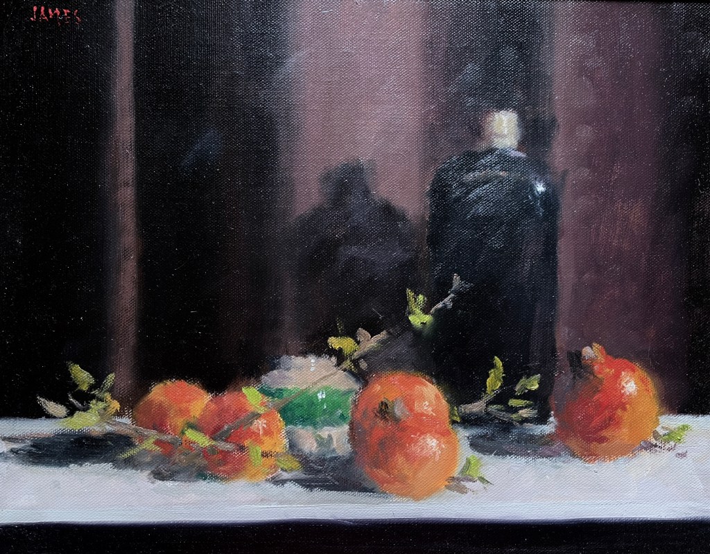 I had been given some really colourful pomegranates with attached branches and leaves and so naturally I wanted to paint them. This particular day was the perfect opportunity with the rain and wind lashing the window, my studio was cosy and after spending some time setting up I started painting. What could go wrong? I had a palette of paint, clean brushes, a piece of linen canvas, great lighting and some Ravel in the background.