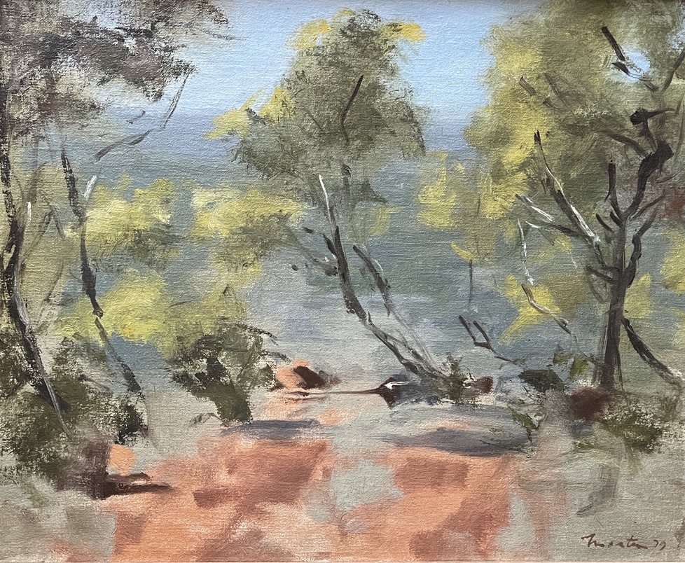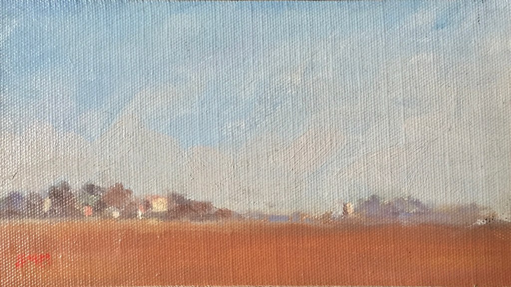 To quote Alan Martin, and most other painting teachers of note, ‘A painting is merely a set of shapes!’. Alan took this further with regard to landscapes saying ‘The majority of landscapes are a set of horizontal stripes and a few vertical disturbances. I think the example above ‘Fallow Ground Italy’, shows this, being basically two major horizontal stripes with a minor one in the centre, broken into smaller vertical disturbances. You cant get much simpler than that.