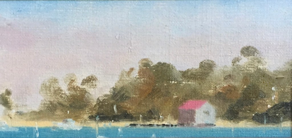 If there is a so-called trick to this method of visual perception, it has to do with initially seeing less rather than more. The best way to do this is to half close the eyes which in effect generalises the shapes and eliminates the detail. Doing this with the above painting and looking for the biggest difference between the subject and your white canvas you can readily see the first task ahead, which in any ‘tonal’ painting is to separate the lights from the darks. Obviously the upper stripe is a light and the balance resolves itself as a dark with a few relatively light disturbances near the bottom including a yellowish minor stripe and a squarish light mark about a third in from the right. The bottom blue stripe could be considered a dark at this stage.